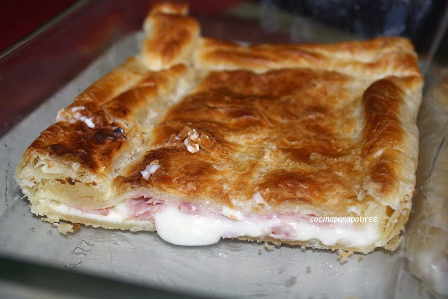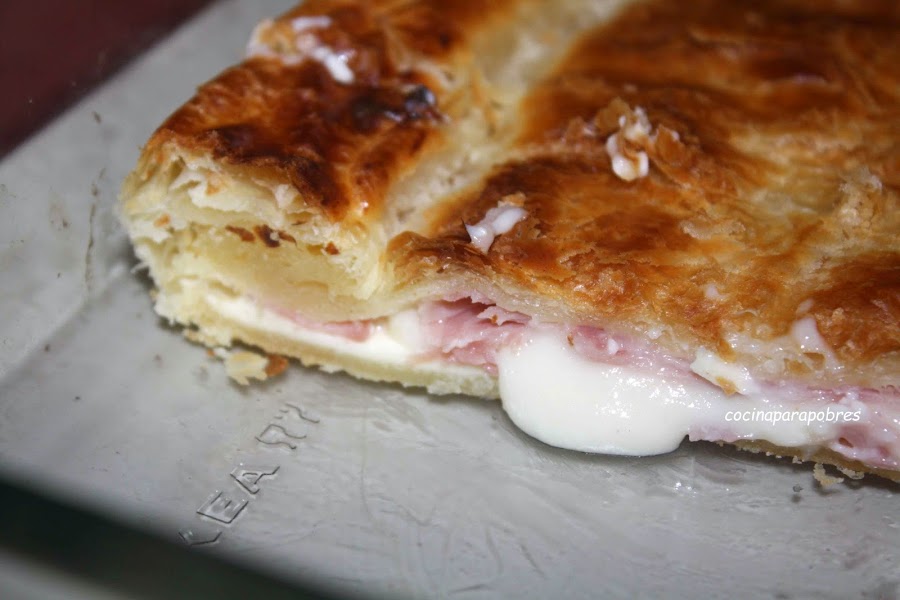 Extendemos una lámina de hojaldre, cubrimos de queso en locha, sobre este repartimos la bechamel y por último una tarda de jamón de york.