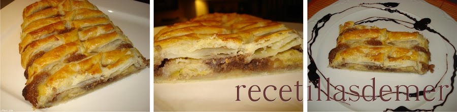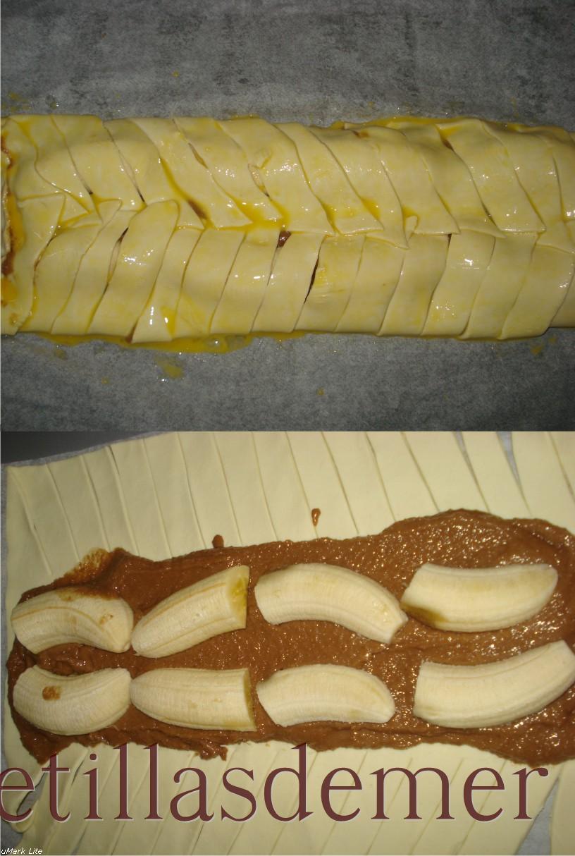 Extendemos la masa sobre papel de horno y vamos a marcarla con un cuchillo tal y como veis en la foto. En la parte central extendemos el relleno de chocolate y sobre él, el plátano en rodajas o abierto por la mitad.