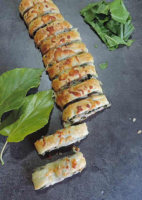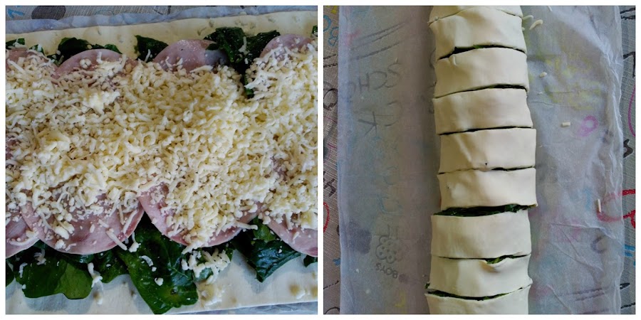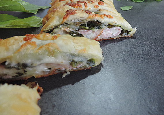 Estiramos la lámina de hojaldre.Colocamos los espinacas limpios y secos sobre el hojaldre.Extendemos las lonchas de jamón o mortadela.Cubrimos con mozzarella rallada.Enrollamos como un brazo de gitano.Cortamos en rodajas.