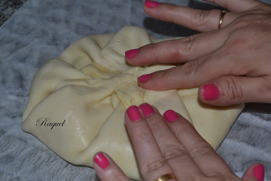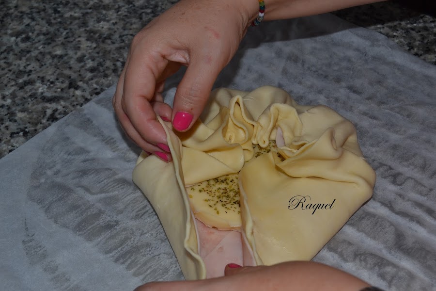 Ahora cerramos el hojaldre hacia adentro y vamos haciendo plegues con los dedos hasta que quede completamente cerrado.