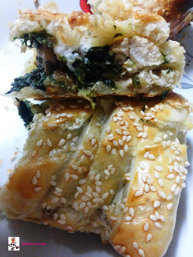 En una sarten ponemos un chorrito de aceite de oliva y sofreímos la cebolla picada en juliana,cuando esté pochadita añadimos las espinacas y mezclamos bien. Añadimos la pechuga de pollo en tiras y las almendras picaditas,ponemos un poquito de sal,removemos y reservamos hasta que enfríe.