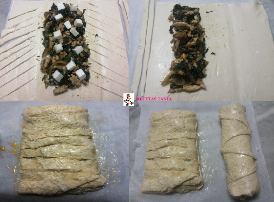 Estiramos la lámina de hojaldre y con un cuchillo afilado cortamos como en la foto. Respetando la parte central y cortando los lados a tiras de un dedo más o menos, ligeramente inclinadas. Rellenaremos la parte central con nuestra mezcla, añadimos unos cuadritos de queso y empezamos a trenzar el hojaldre. Se puede hacer cuadrado,redondo,en rollo (como el otro que hice)....o como queráis.