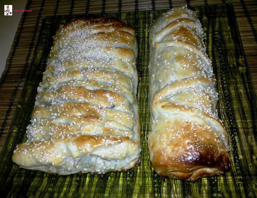 Calentamos el horno a 180º C, pintamos con huevo el hojaldre, decoramos con semillas de sésamo y al horno unos 15-20 minutos, vigilando que no se nos queme.