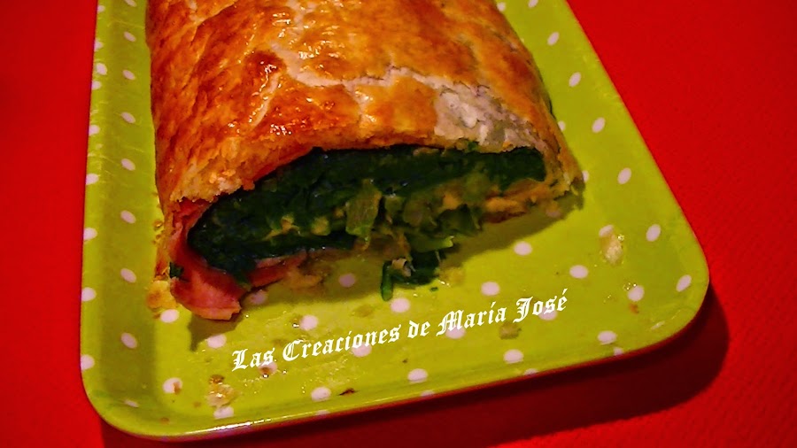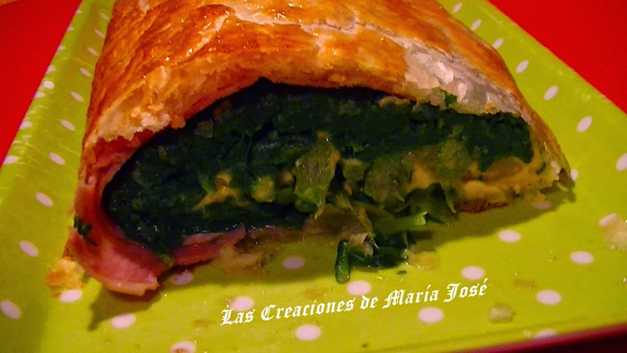 Limpia, lava y cuece los espárragos 12 minutos en agua salada y escurre. Limpia, lava y seca las espinacas. Extiende el hojaldre. Cubre con una capa de jamón, de espinacas, de queso y de espárragos. Enrollalo y sella los bordes. Precalienta el horno a 250º. Forra una fuente con papel de horno y pon el rollo con el doblez hacia abajo. Pincela con el huevo ligeramente batido y hornea 20 minutos. Dejar templar y servir.