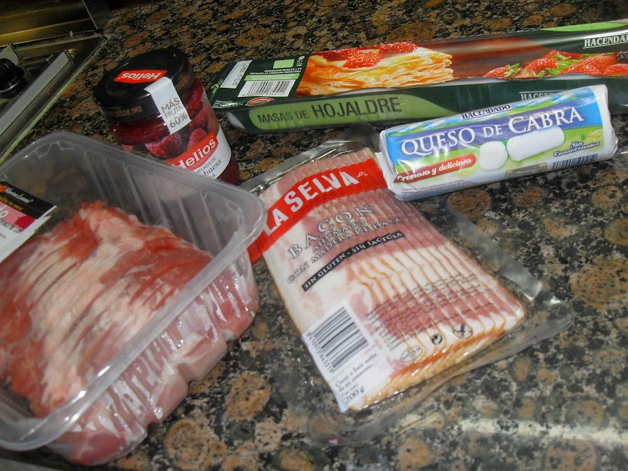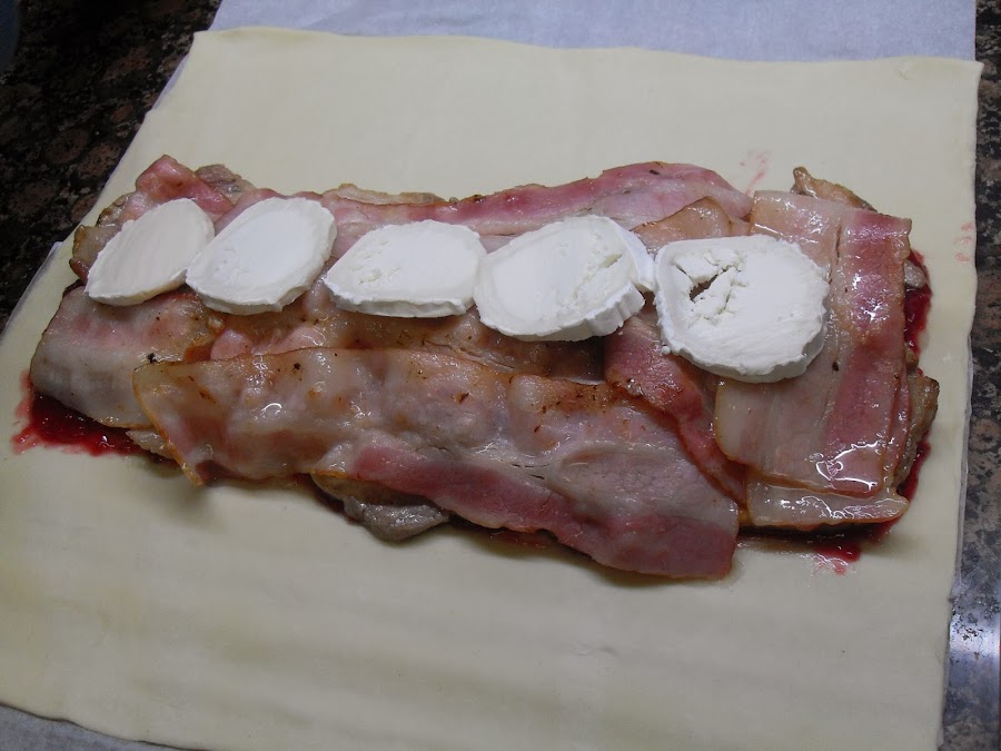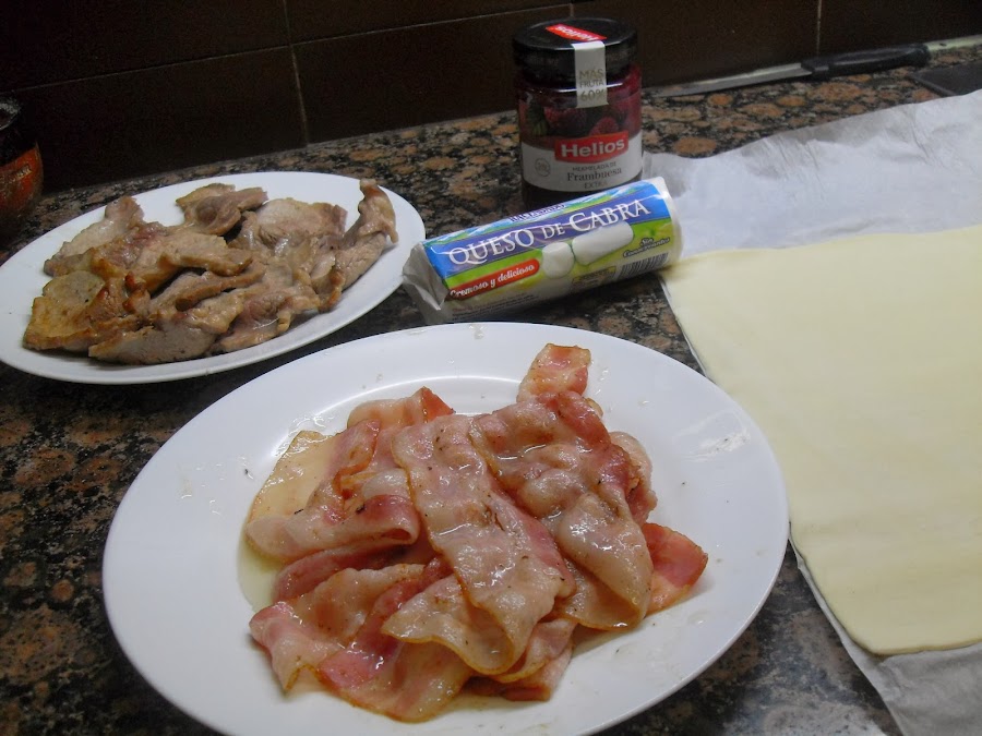 Cortar rodajas de queso de cabra y colocar por encima del bacón.