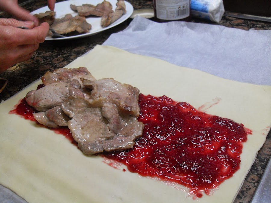 Sobre la capa de mermelada cubrir con la carne, como en la foto.