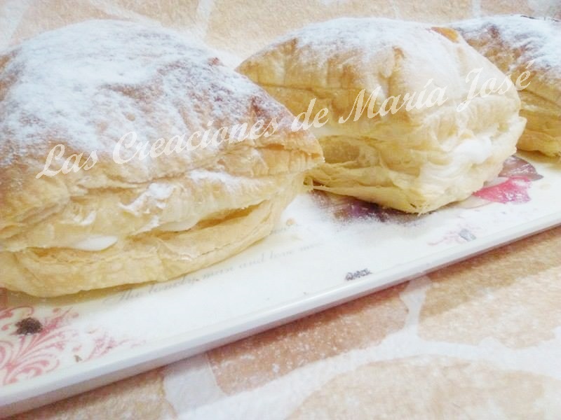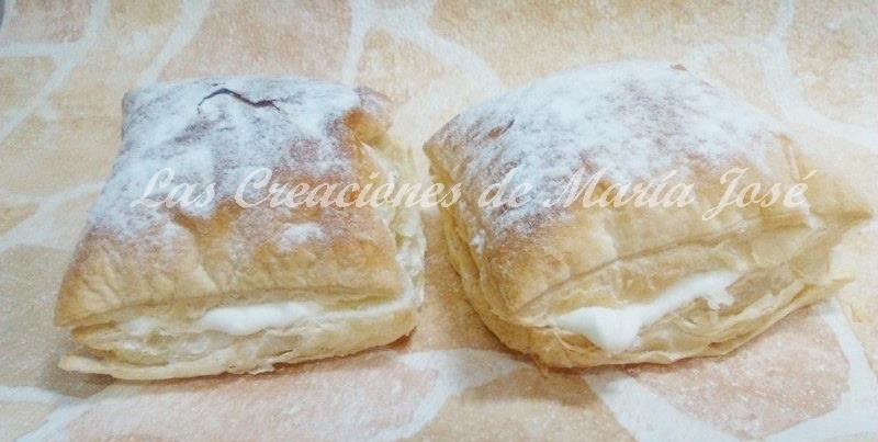 Precalentar el horno a 180º. Extender el hojaldre y cortarlo en 4 cuadrados. Metemos en el horno unos 20 - 25 minutos o hasta que este doradito. Mientras hacemos la nata (crema de leche). Montamos la nata (crema de leche) bien fría, cuando la nata (crema de leche) empiece a coger cuerpo, vamos añadiendo el azúcar glas en forma de lluvia. Seguimos montando la nata (crema de leche), con cuidado de no pasarnos, sino se convertirá en mantequilla.La metemos al frigorífico hasta que el hojaldre este frió. Cuando este listo lo abrimos a la mitad y lo rellenamos con la nata (crema de leche).