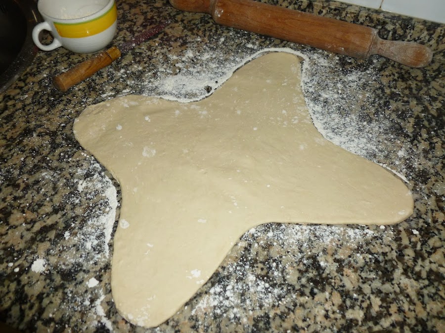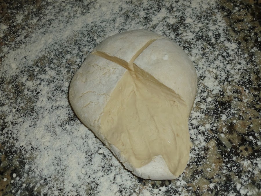 Transcurrido el tiempo de reposo, tomar la bola de masa, poner en una superficie previamente enharinada y hacer dos cortes para dividir la masa en cuatro, pero sin cortarla totalmente.