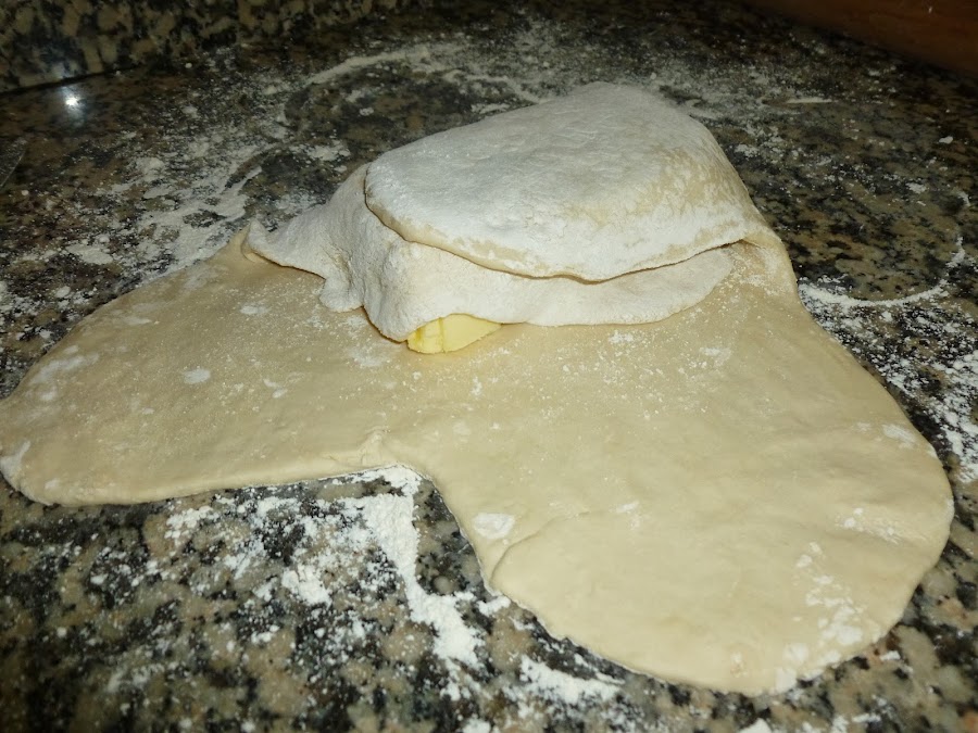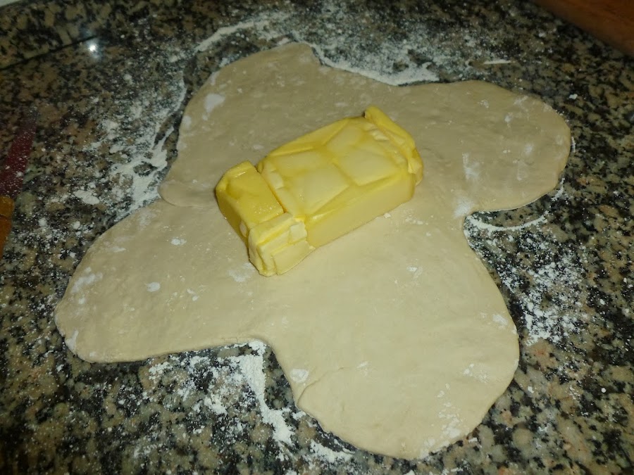 Una vez estirada la masa, colocar en el centro el bloque de mantequilla e ir cubriéndola con cada uno de los brazos de modo que quede hecho un paquete bien cerrado.