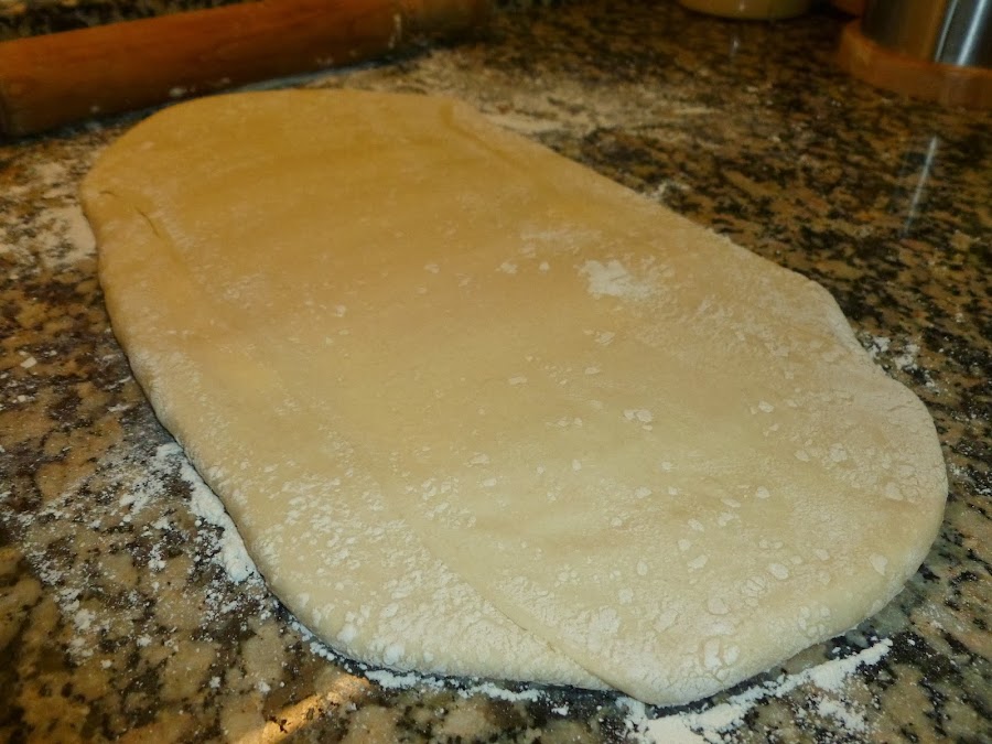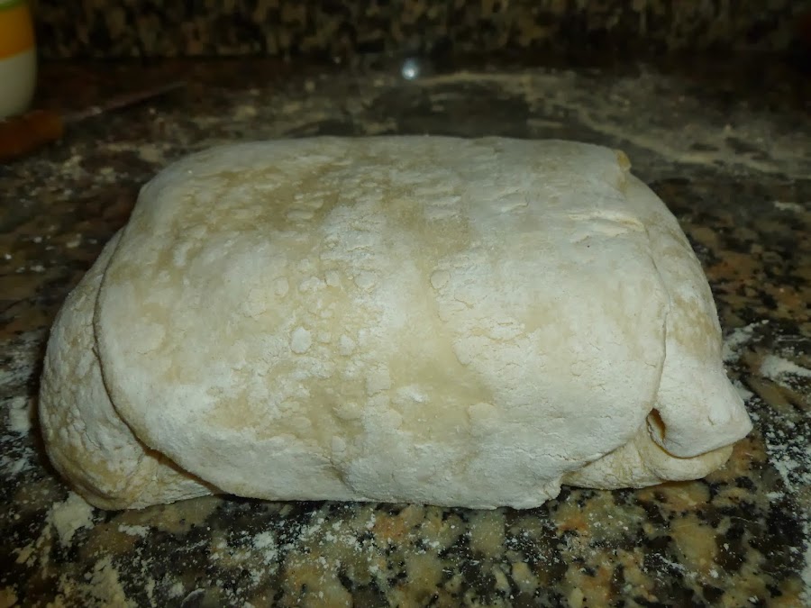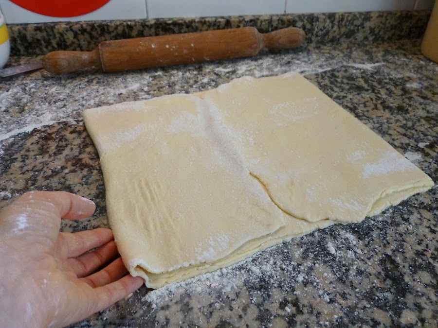 Cuando tengamos extendido un rectángulo de más o menos un centímetro de grosor, doblar la masa en tres, doblando primero el lado a nuestra izquierda y luego el de la derecha. Después, volver a extender formando el rectángulo pasando el rodillo a lo largo, dejando la doblez hacia nuestro lado izquierdo.