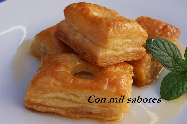 Una vez fríos, preparamos un almíbar con el agua , el azúcar y la miel, cuando esté hecho, apartamos del fuego y vamos pasando los hojaldres rapiditos, vuelta y vuelta para que no se empapen.