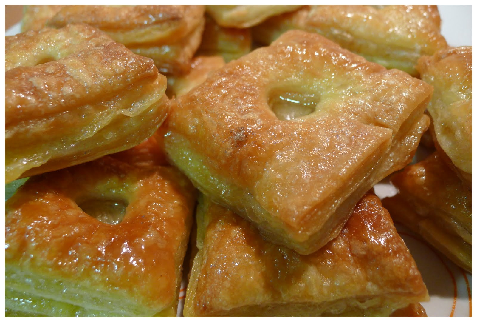 Una vez horneado el hojaldre,preparamos el almibar de miel.Ponemos en un cazo grande el agua,azucar,miel y zumo de limon y llevamos al fuego,lo dejaremos 5 minutos a fuego fuerte y luego lo bajamos al minimo unos minutos.Ya tendremos el almibar a punto,con lo que vamos sumergiendo los hojaldres en el por espacio de entre 10 y 20 segundos por cada cara y los vamos colocando en una fuente o plato,asi con todos.