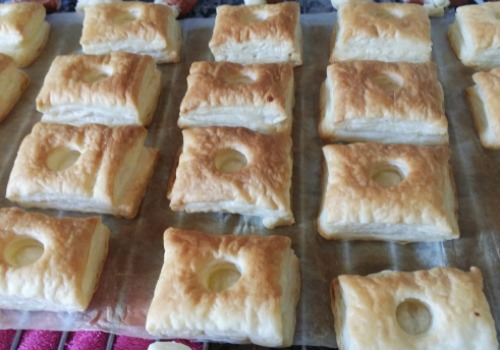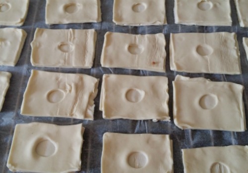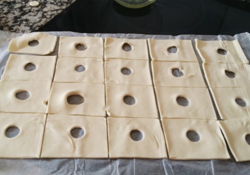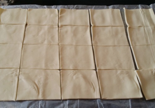 Abre las láminas de hojaldre y marca las medidas de los cuadraditos (la medida perfecta son rectángulos de 6X5 cm).