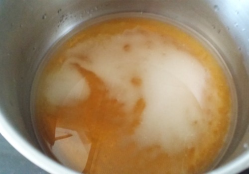 Cuando hierva separa del fuego y añade la hoja de gelatina previamente escurrida. Remueve muy bien.