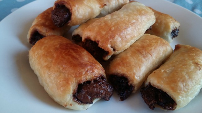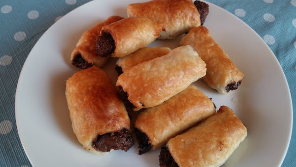- Pintar con chocolate cada una de las tiras de hojaldre.
