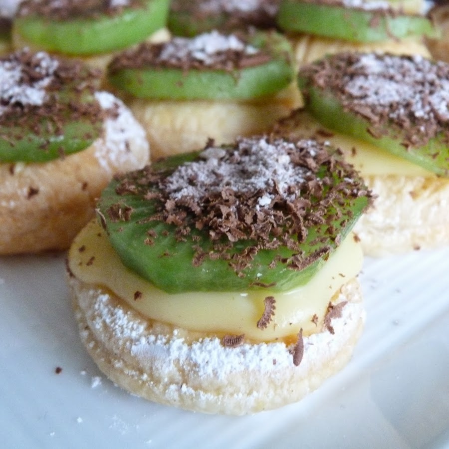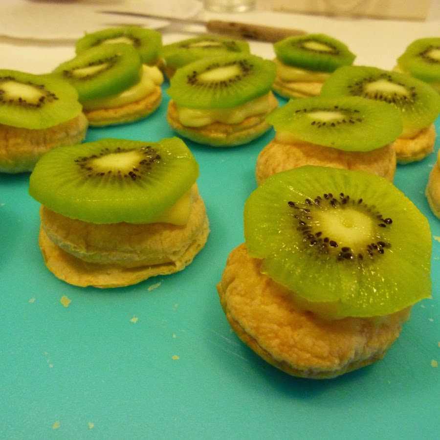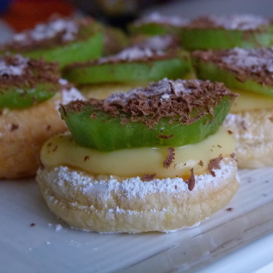 Finalmente cogemos los círculos de hojaldre, echamos un poco de crema por encima y lo rematamos con una rodaja de kiwi y la ralladura de chocolate, yo en esta ocasión eché un poco de azúcar glass a método de decoración. ¡A disfrutar!