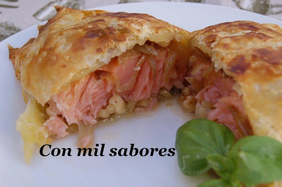 Extendemos la lámina de hojaldre y la cortamos en rectángulos de un tamaño aproximadamente el doble de los lomos de salmón. Ponemos sobre cada porción de hojaldre el lomo de salmón y lo cubrimos con cebolla caramelizada, cerramos el hojaldre formando un paquetito ,dejando en el interior el salmón y la cebolla caramelizada,cerramos, pintamos el hojaldre con huevo batido y pinchamos con un palillo. Horneamos a 200º hasta que el hojaldre esté bien dorado y crujiente.Que fácil, sano y rico!!!!.