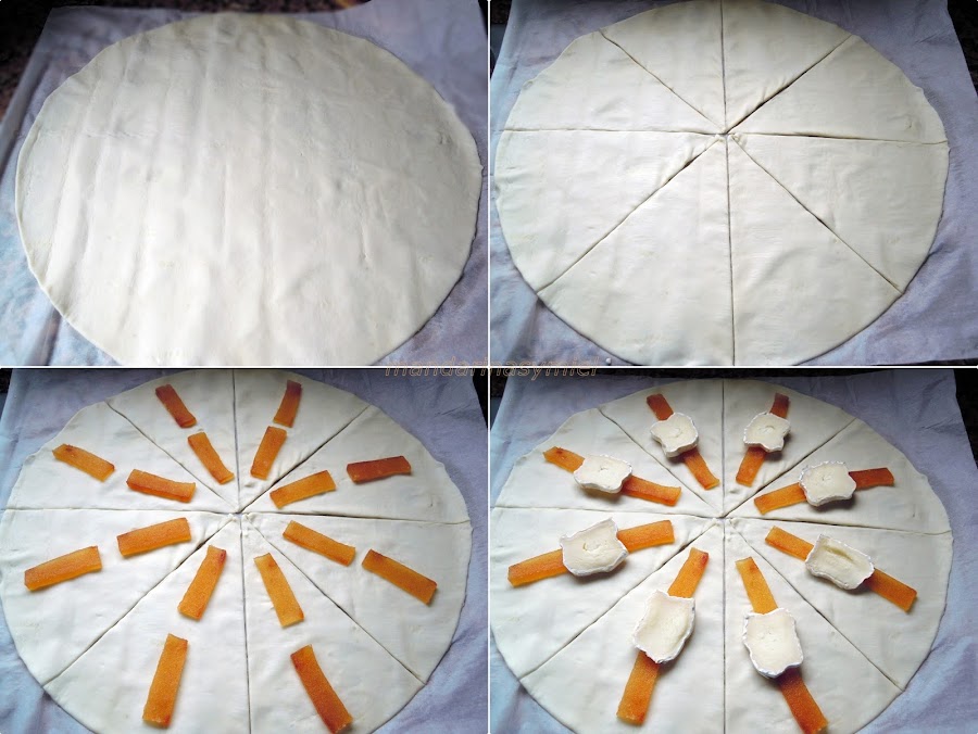 Si el hojaldre es redondo, corta la lámina en 8 triángulos iguales. Si tu lámina es rectangular, corta la masa en cuadrados de unos 4 o 5cm. de lado y sigue los mismos pasos.