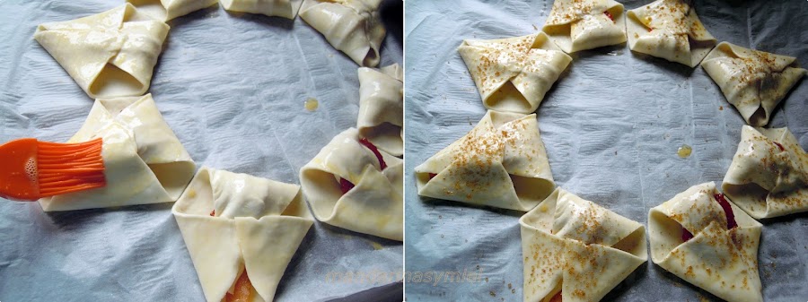 Pinta cada hojaldre con huevo batido y espolvorea con azúcar moreno.
