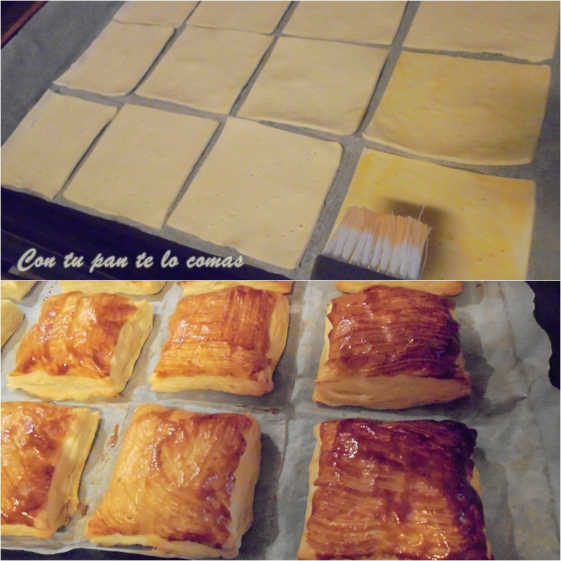 1. Pon una hoja de papel vegetal en la bandeja del horno. Corta la lámina de hojaldre en cuadrados, pínchalos con un tenedor y píntalos con huevo batido. Yo los pinté con parte de las yemas que sobraron del merengue para aprovechar, y por eso salen un poco más oscuros.