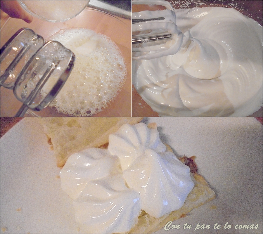 Ya sabes que hay varios tipos de merengue: el italiano que se elabora con almíbar y dura varios días sin bajarse, luego tenemos el merengue suizo que se elabora al baño maría, y por último el merengue francés, el más básico, que se hace batiendo sencillamente las claras de huevo con azúcar.