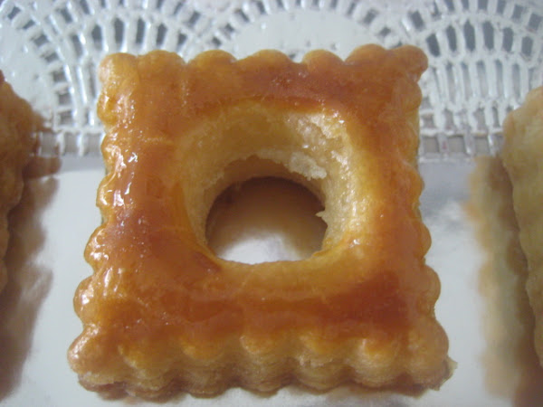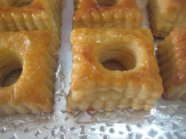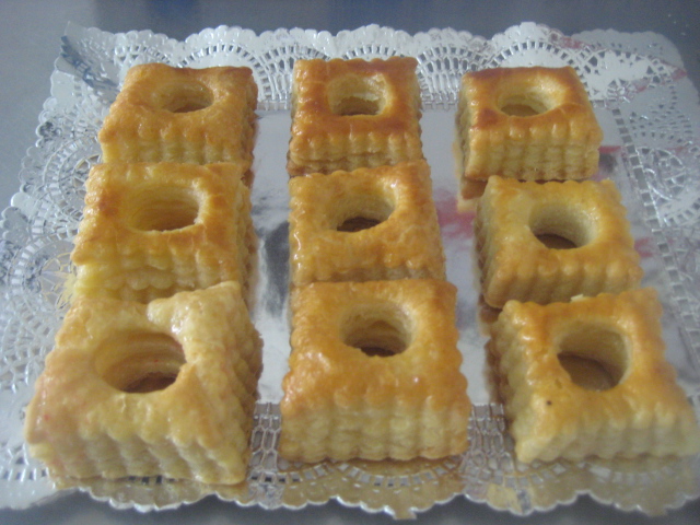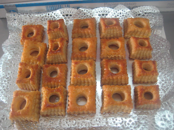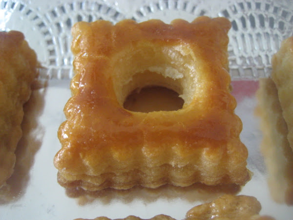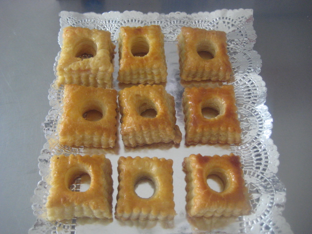 Preparación: Si empleamos hojaldre hecho en casa, siguiendo la receta enlazada, laminamos el hojaldre a 1/2 cm. de grosor. Con un molde cuadrado o rectangular cortar las piezas y hacer con otro molde pequeñito redondo un agujero en el centro. (Yo hago el agujero del todo y no sólo en la primera capa. Me gusta más. Pincelar con huevo batido y cocer en el horno a 185-190 º C durante 15 minutos aproximadamente. Una vez horneadas dejar sobre rejilla. Mientras se están horneando las piezas de hojaldre, preparar un almíbar con el agua, la miel y el azúcar y dejar que cueza 4 minutos desde que empiece a hervir. Una vez hecho dejar enfriar hasta que esté templado. Cuando los hojaldres y el almíbar estén templados bañarlos dejando que se calen durante unos 40 segundos por cada lado. Dejar que escurran un poco sobre la rejilla, poniendo un papel debajo y cuando hayan escurrido colocar en bandeja. Es preferible hacerlas de un día para otro