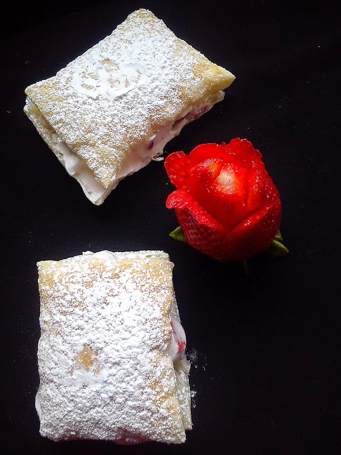 Cogemos los cuadraditos de hojaldre y los partimos por la mitad, rellenamos con las fresas con nata (crema de leche) y tapamos. Espolvoreamos con azúcar glass y listos para comer!!!