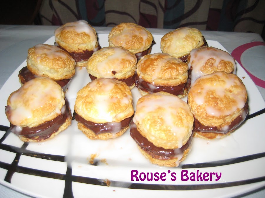 Una vez el hojaldre y el ganache estén fríos procedemos al montaje. Sobre un disco de hojaldre ponemos una parte de ganache con ayuda de una manga pastelera, es mejor así para evitar que el hojaldre se pueda romper. Tapamos con otro disco de hojaldre y lo bañamos con el glaseado de azúcar. Así con todos los discos.