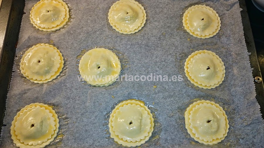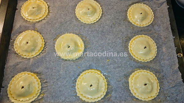 Pintar los 9 grandes con huevo batido y meter una cucharadita de relleno en el centro.