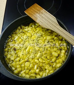 Lavamos y pelamos las manzanas. Extraemos el corazón y las cortamos a cuadraditos.