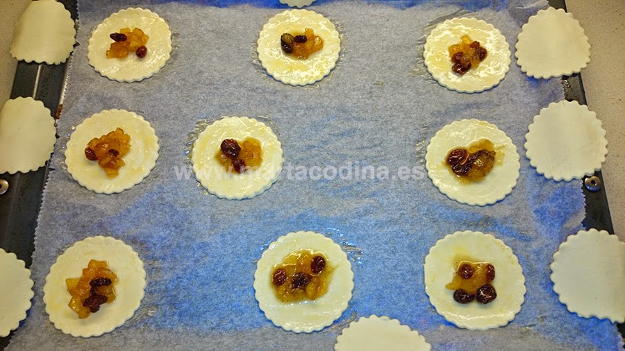 Cortar la pasta de hojaldre en 18 círculos con una corta-pastas. Podéis hacer 9 de un diámetro superior para darles un poco de forma, es decir, 9 grandes y 9 más pequeños.