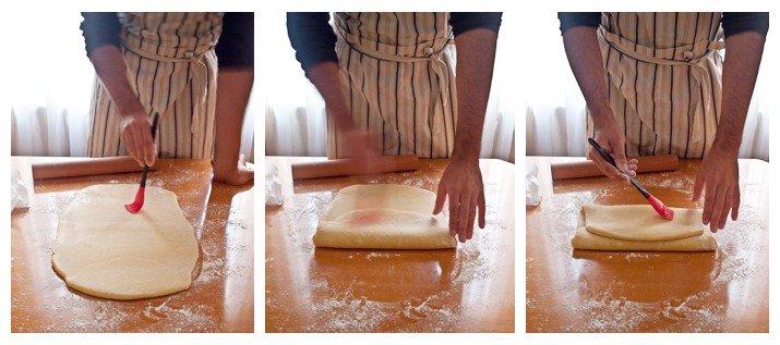 – Giramos la masa y estiramos de nuevo formando un rectángulo de nuevo de un centímetro de alto. Repetimos los pasos anteriores de doblar y harina. Queremos formar una nueva parte de capas.