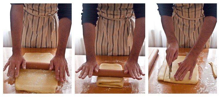 – Estiramos la bola formando un rectángulo con la ayuda de un rodillo sobre una superficie previamente enharinada ligeramente. El rectángulo debe tener un grosor de un centímetro, más o menos.