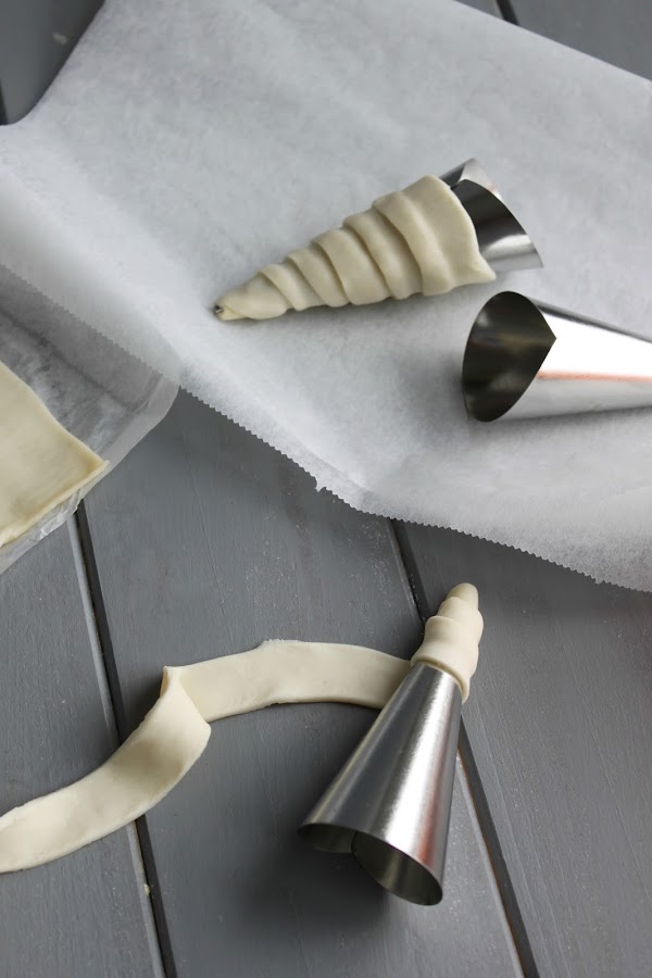 3. Engrasamos ligeramente los conos y vamos enrrollando cada tira de hojaldre en los conos, desde la punta y de manera que cada vuelta posterior quede sobre la anterior (así conseguimos hojaldres más "robustos")
