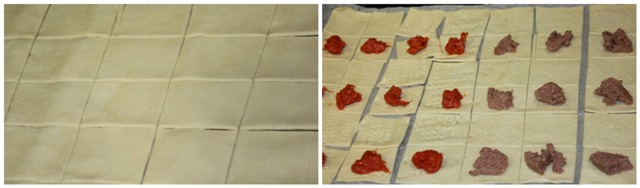 Dejaremos la mitad de los cuadrados sin rellenar, y en el resto pondremos un poco de sobrasada en la mitad, y en la otra mitad paté.
