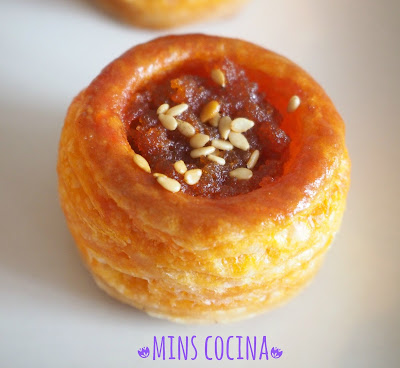 - Rellenamos los hojaldritos generosamente, y espolvoreamos unas semillas de sésamo por encima. Metemos entonces al horno, a 160ºC unos 8-10 minutos, para que el hojaldre se tiña del color de la sobrasada.