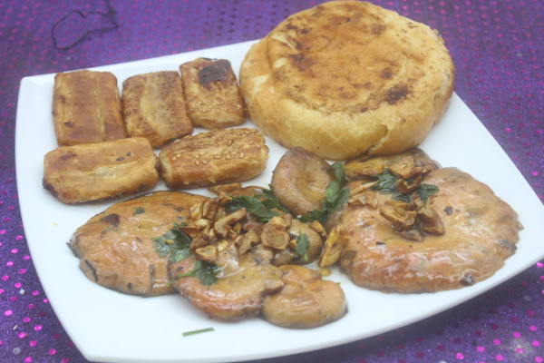 Repartimos los robellones, los hojaldritos y el pan entre dos platos.