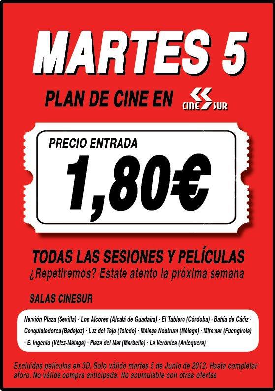 LES RECUERDO QUE HOY PUEDEN IR A CINESUR A VER LA PELÍCULA QUE DESEEN POR SOLO 1,80 EUROS POR PERSONA.