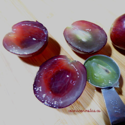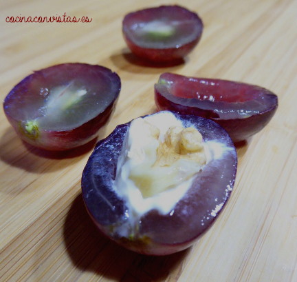 Lavamos y secamos las uvas, las cortamos por la mitad y con ayuda de un sacabolas pequeño retiramos la pulpa interior.