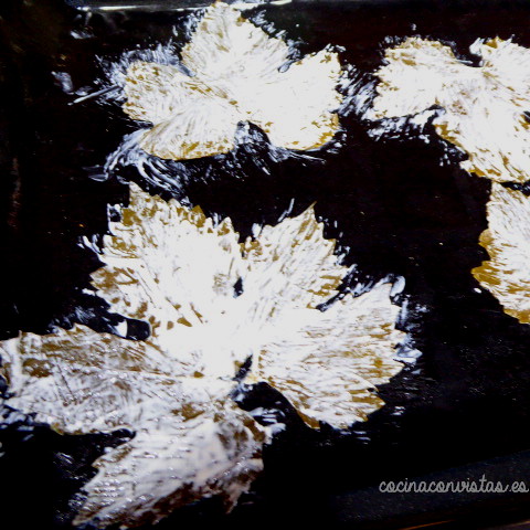 Introducimos las hojas en el horno y dejamos que se vayan cociendo y secando unos 20 minutos. Sacamos del horno y dejamos enfriar. Quedarán con la textura de un papel crujiente.