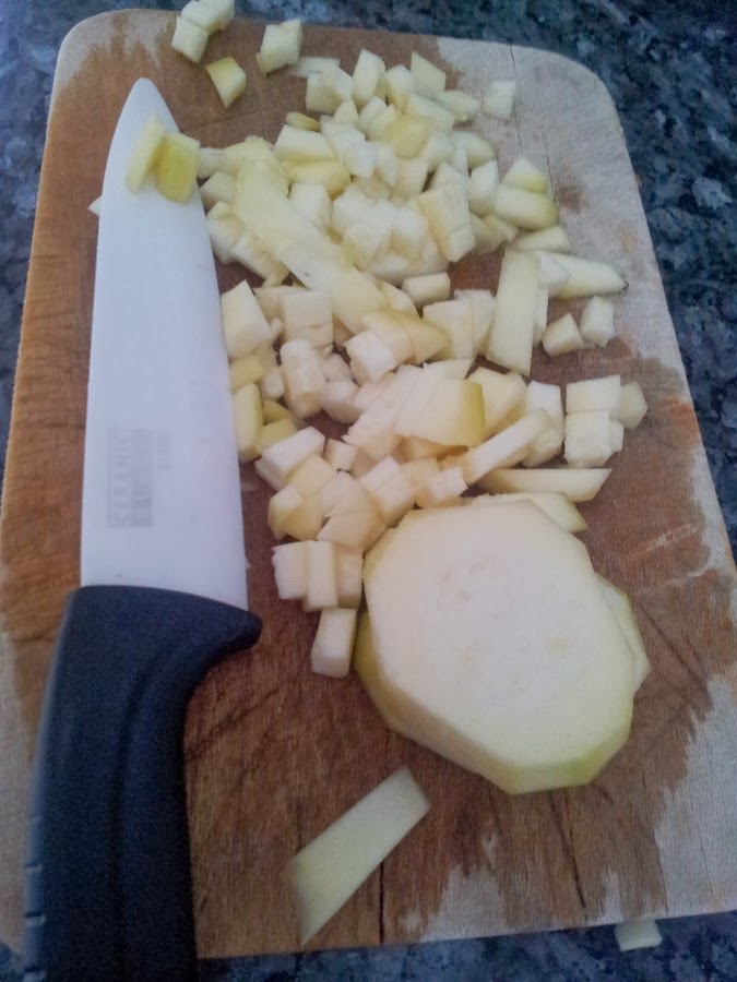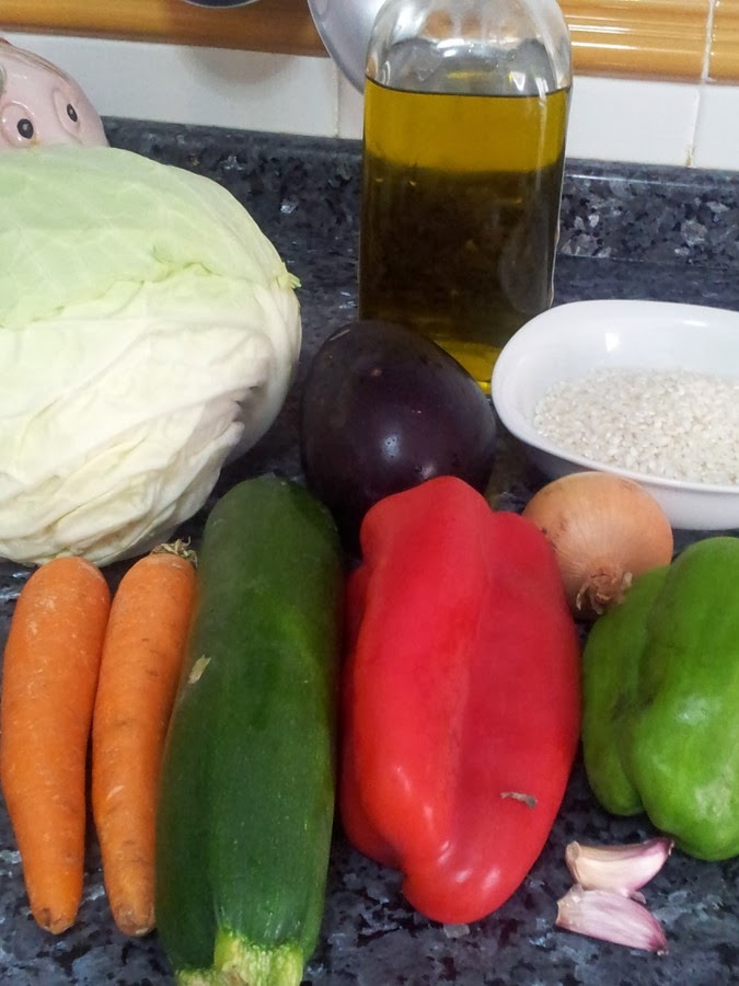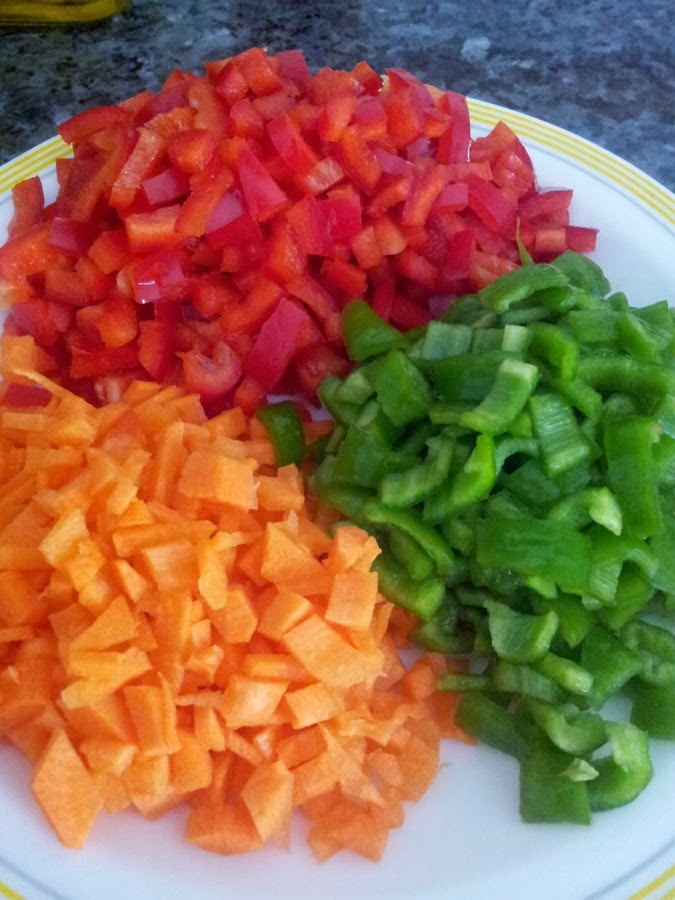 Mientras se nos va cociendo el arroz unos 20 minutos apróximadamente vamos cortando en trozos pequeños las hortalizas.