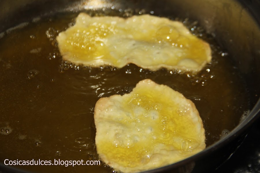 Una vez tengamos lista nuestra masa tomamos pequeñas porciones que estiramos muy muy finas y freímos en abundante aceite.