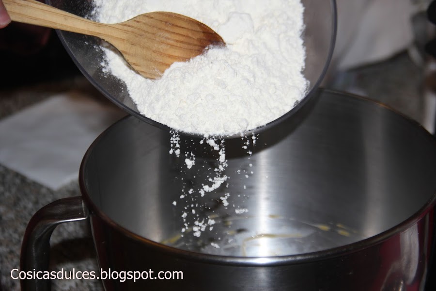 Agregamos seguidamente la harina y amasamos bien. Si es necesario podremos añadirle un poco más de harina hasta lograr una masa manejable.