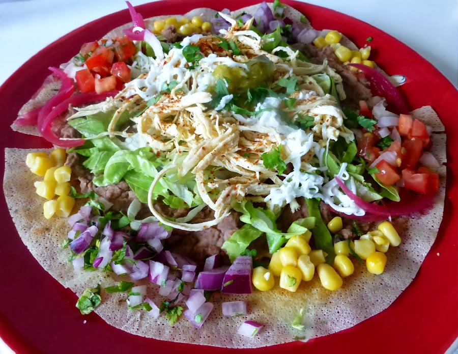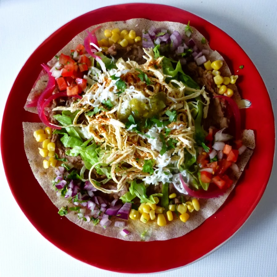 Sobre una oblea ponemos la mitad de los frijoles calientes aplastados y encima la mitad de la lechuga, luego la mitad del pollo, esto lo cubrimos con el queso rallado y una lluvia de cilantro que coronamos con una cucharada de salsa de tomatillo verde.