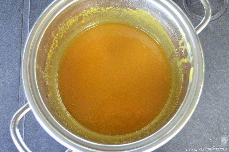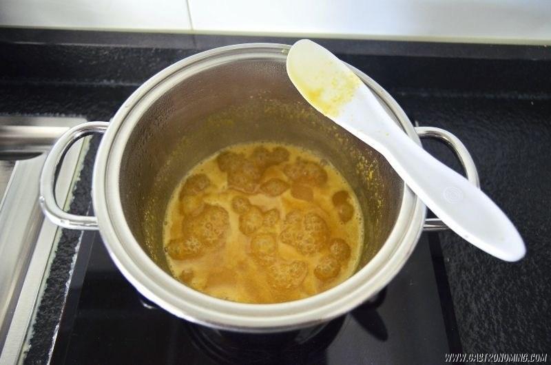 1. En una cazuela a fuego alto ponemos el agua, el vinagre de manzana y la miel removiendo constantemente hasta diluir la miel y que la mezcla sea homogénea.