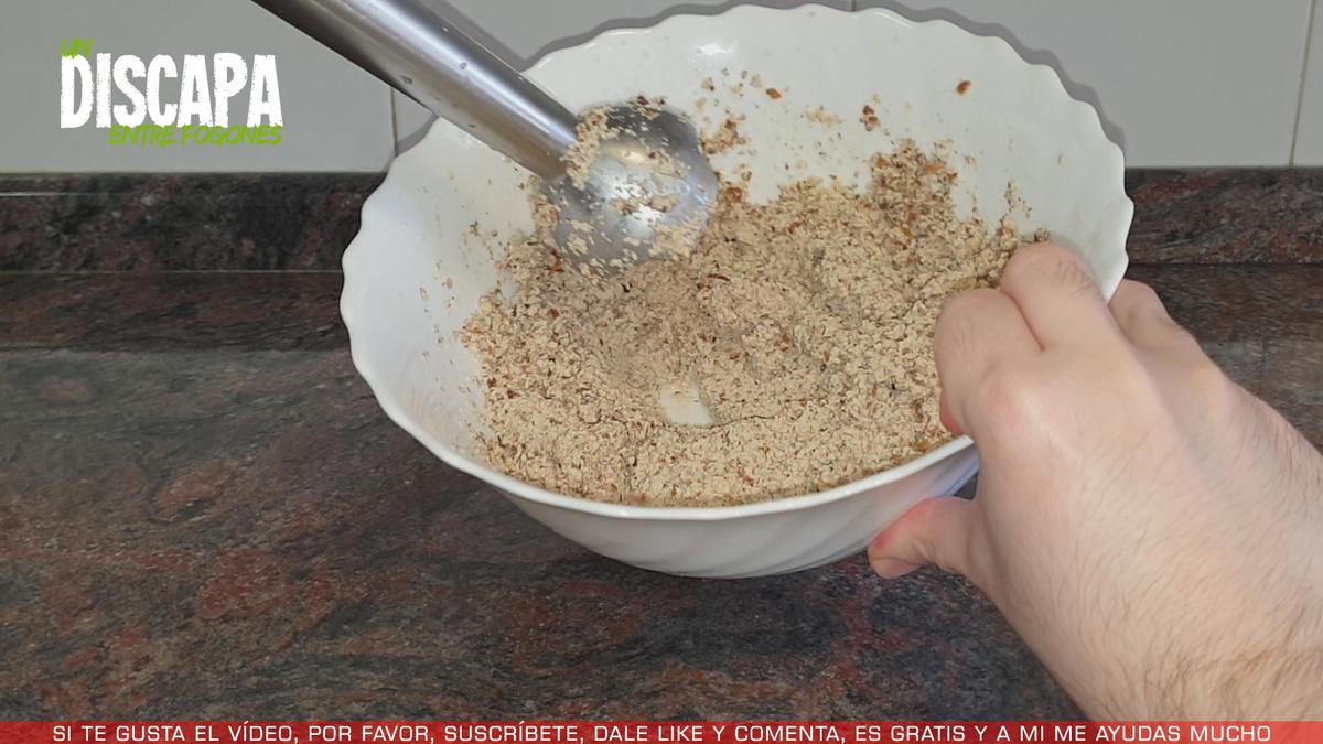 2Las escurrimos y las ponemos en un recipiente amplio. Ahora añadimos unos 250 mililitros de agua fría. Y trituramos hasta conseguir una pasta como esta.