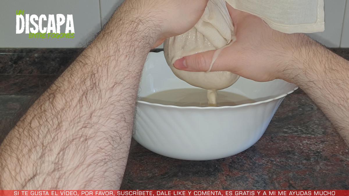4Ahora en otro recipiente amplio extendemos una tela o estameña, esto nos ayudará a colarlo y conseguir una horchata sin grumos. Vamos pasando el contenido de un recipiente al recipiente con la tela. Y ahora con cuidado vamos cogiendo las puntas de la tela y formando una especie de bolsa o de paquete que iremos apretando para que vaya saliendo la mayor cantidad de líquido posible.