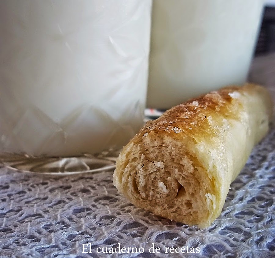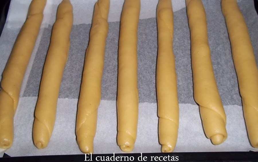 * Aplanamos con el rodillo y enrollamos cada porción sobre sí misma como si fuese un cigarro, ya tenemos formados los Fartons, colocamos sobre una bandeja de horno y dejamos que doble volumen.