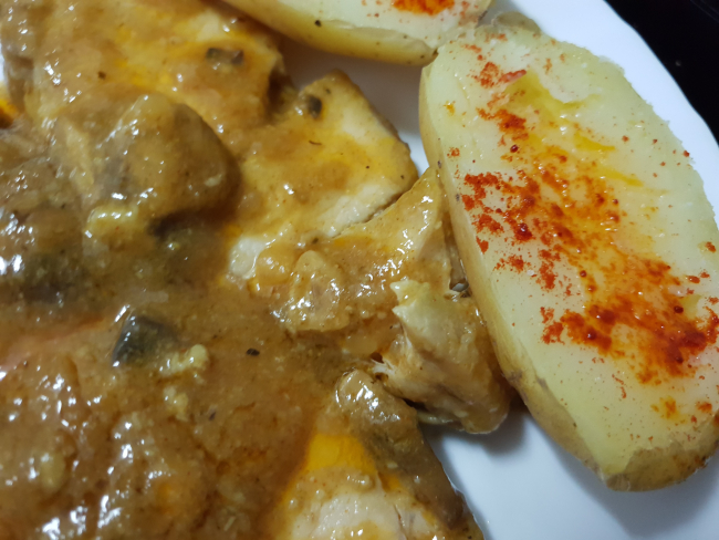 Para espesar la salsa, ponemos una sartén al fuego con una cucharadita de maicena. Tostamos la harina y le damos unas vueltas. Añadimos el líquido del adobo y damos vueltas hasta que espese.