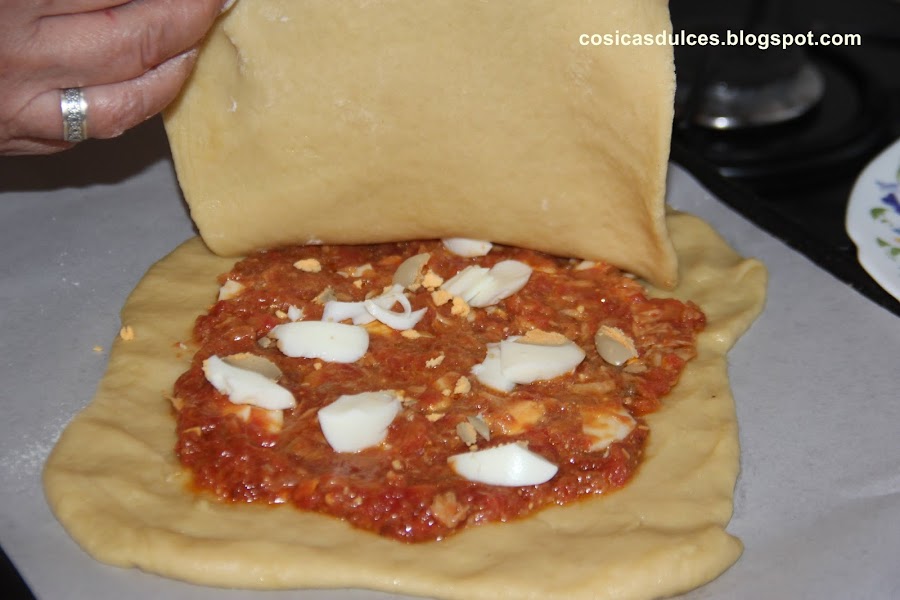 Tomamos porciones de la masa. Estiramos fina y colocamos sobre ella el relleno. Tapamos con otra porción de masa.